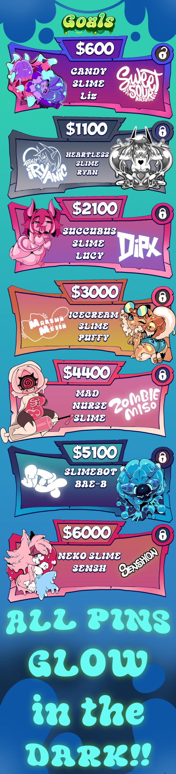 Do you like squishy slime girls? Well you’re in luck, these jumbo 3inch pins are perfect for your collection!! This is a PREORDER, but with this preorder, you’re guaranteed the opportunity of getting every pin! This project will also be up on Kickstarter on May 4th but without the preorder discounted price! If you preorder all the pins, you get a holographic sticker pack of all the slime gals!! These stickers are weather proof so they are durable on their forever home! The estimated time for production is June and shipment should start around August but there could be delays due to manufacturing and shipping!